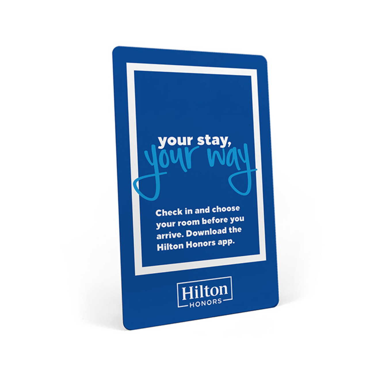 La carte-clé Hilton Honors « Your Stay, Your Way » est une carte d’accès RFID haut de gamme, approuvée par les franchises et développée pour Hilton Hotels & Resorts. Imprimée sur du PVC de haute qualité avec un motif imprimé bleu, cette carte arbore la marque officielle Hilton Honors et est conçue pour répondre aux normes opérationnelles des établissements Hilton du monde entier.
